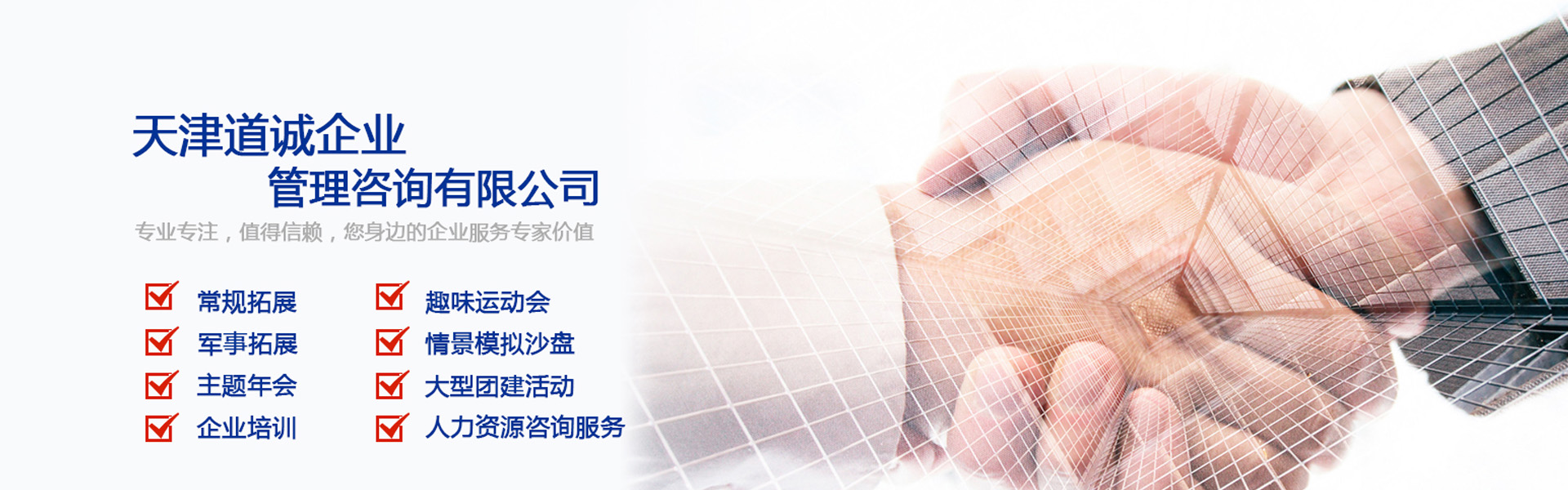 ? ? 道誠培訓是天津道誠企業(yè)管理咨詢有限公司旗下品牌,公司涉及的領域有:拓展培訓(團建)、企業(yè)內(nèi)訓、真人cs、戶外野戰(zhàn)訓練、企業(yè)年會、企業(yè)家庭日、趣味運動會、軍事魔訓及人才培訓和人才測評等多項企業(yè)培訓及人才開發(fā)咨詢服務項目。? ? ?道誠培訓在京津冀區(qū)域擁有多個大型的戶外拓展訓練基地和軍事野戰(zhàn)訓練營地,并擁有一批從事行業(yè)內(nèi)十余年經(jīng)驗的拓展培訓師和優(yōu)秀的退役軍官,為不同領域的企業(yè)在發(fā)展戰(zhàn)略、領導能力、團隊建設、客戶服務、經(jīng)營管理、人力資源和企業(yè)文化和高等學校提供優(yōu)質(zhì)服務和解決...